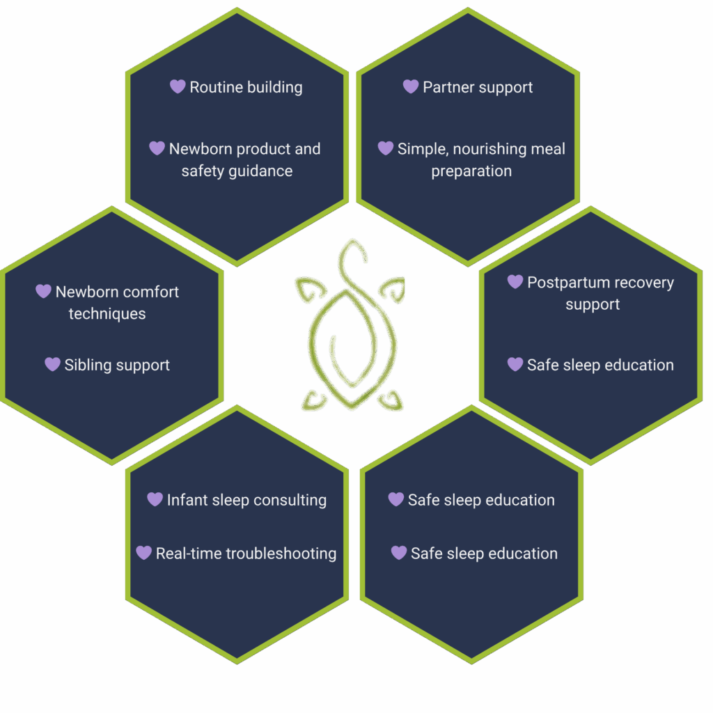 I provide comprehensive postpartum doula services including newborn care, breastfeeding support, light housekeeping, meal preparation, and emotional support for new families during the crucial first weeks after birth.